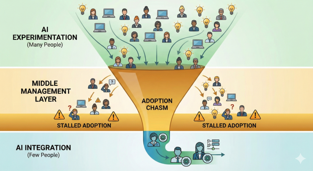 중간 관리자들이 AI 도입에 적극적으로 참여하지 않거나, 부하 직원들의 AI 활용을 장려하지 않으면, AI는 조직 깊이 침투하지 못한다.